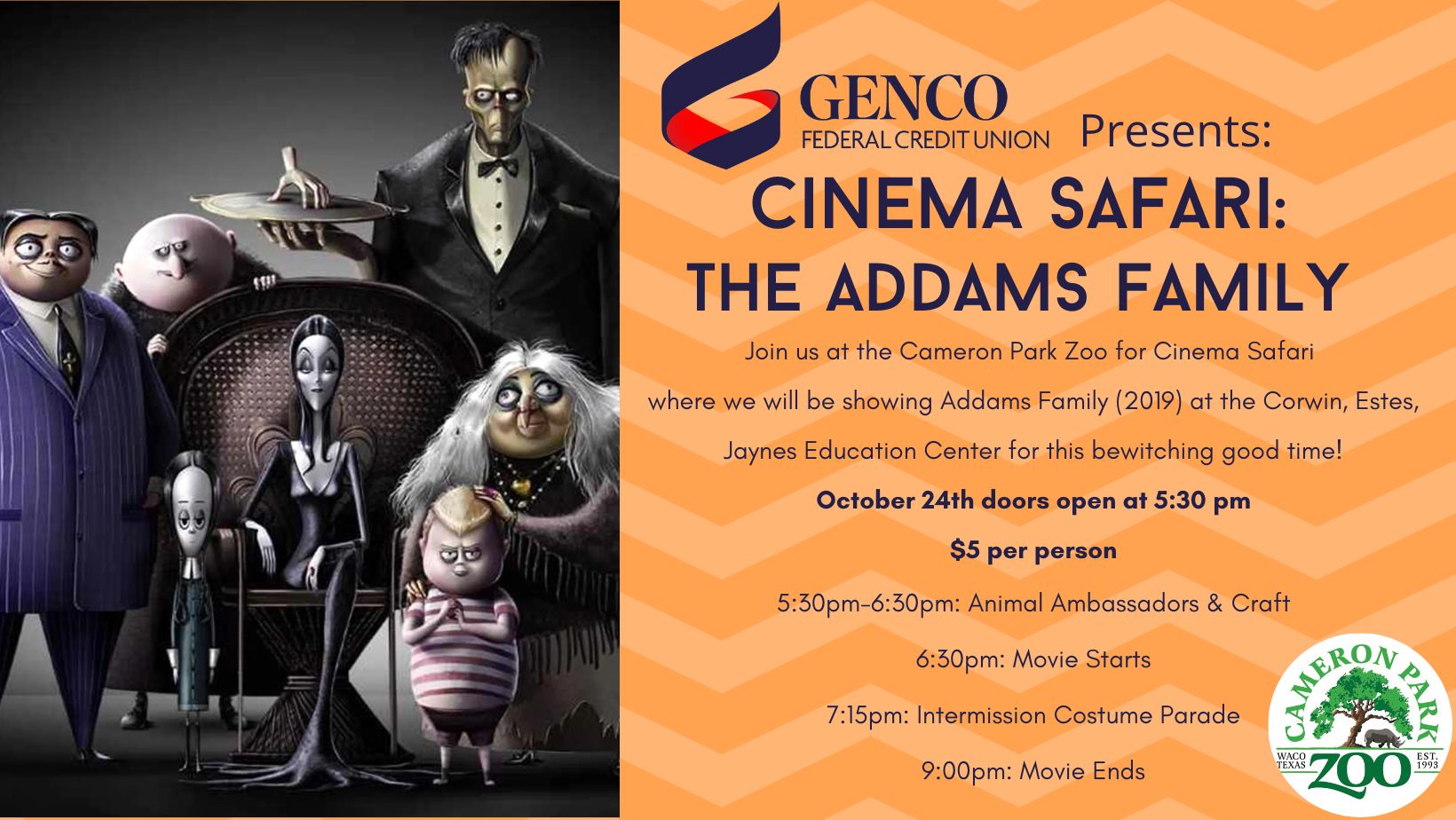 Join us at the Cameron Park Zoo for Cinema Safari where we will be showing Addams Family (2019) at the Corwin, Estes, Jaynes Education Center for this bewitching good time!